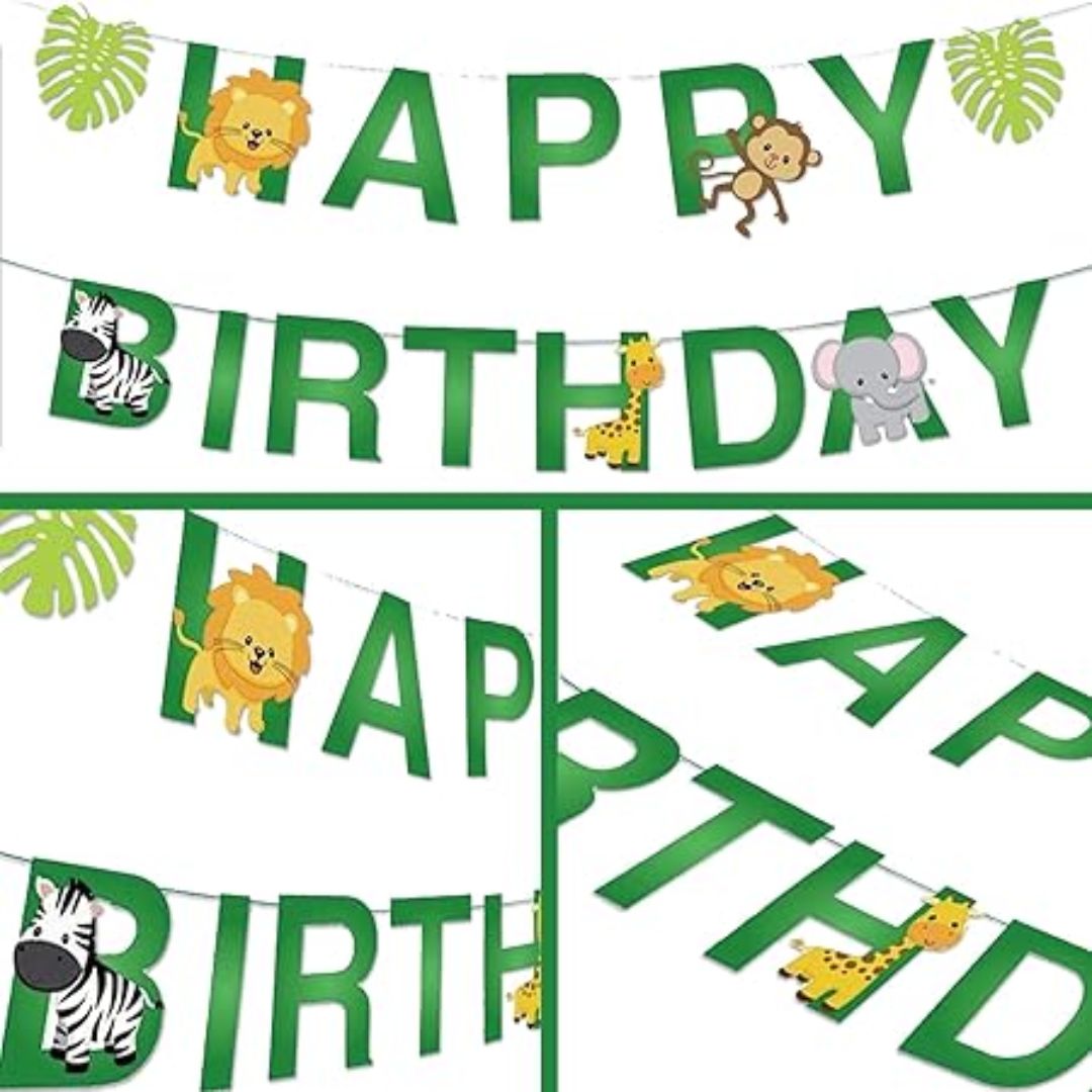 • JUNGLE SAFARI ANIMAL BIRTHDAY BANNER: You will get a 1pc jungle safari theme banner with "HAPPY BIRTHDAY", 2Pcs Tropical Leaf cards (As Picture), 2Pcs 8.37 Ft long Rope. They can enhance your party's atmosphere, while they can also be applied as photography backgrounds and props for you to take beautiful photos with your family and friends.