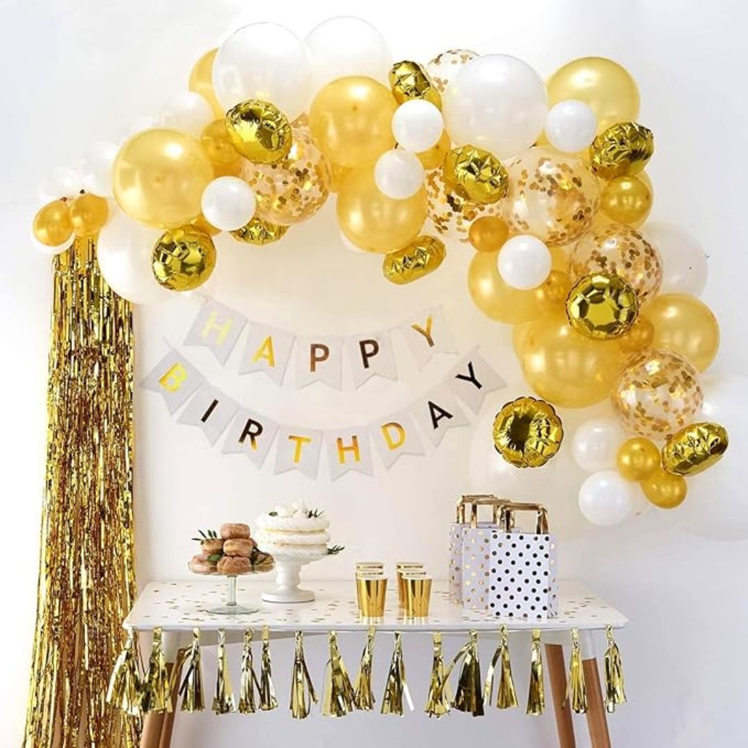 • GOLD HAPPY BIRTHDAY BANNER SET: Gold birthday party decorations set - 1 * Metallic HAPPY BIRTHDAY banners and 8 * gold confetti balloons.